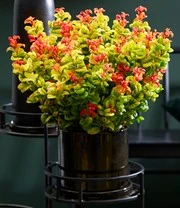 Fascinerend! Als de druifheide Curly Gold® in de lente nieuw uitloopt is deze prachtig oranjerood. In de loop van de zomer verandert dit naar goudgeel om dan naar goudgeel met groen te wisselen. Niet alleen het kleurenspel is bijzonder mooi, ook de verdraaide vorm van het glanzende blad is bijzonder. Plant deze groenblijvende sierstruik als mooi accent in uw tuin, of in een pot op het terras of balkon. De druifheide Curly Gold® (Leucothoe axillaris) blijft mooi compact en bossig. Vanaf mei siert de plant zich met decoratieve witte bloemen. Een verder voordeel is nog de goede winterhardheid tot -22° C en het feit dat ze weinig eisen stelt.